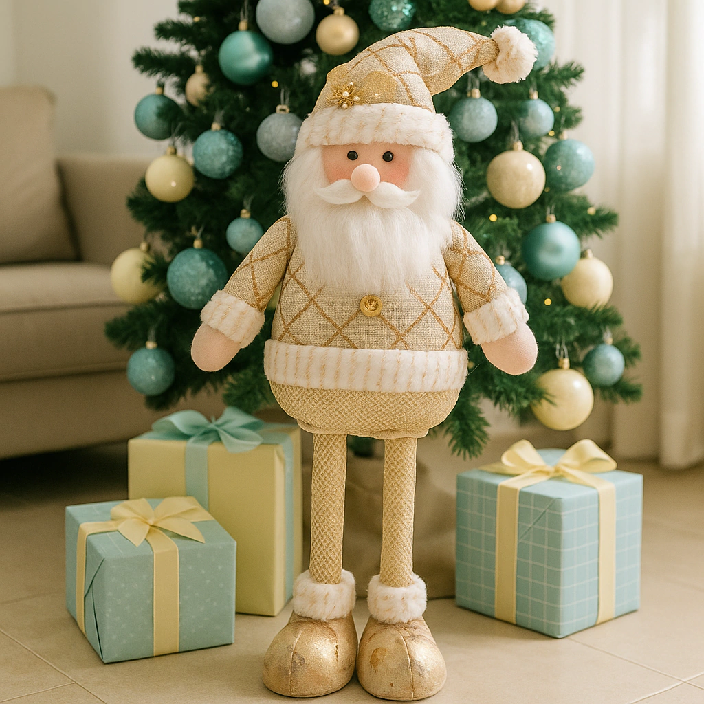 Decora tu hogar con este elegante Muñeco Papá Noel en color dorado y blanco, ideal para la temporada navideña. Cuenta con patas rebatibles que permiten ajustar su altura: 40cm con patas cortas y hasta 55cm con patas largas. Su diseño sofisticado aporta un toque festivo y moderno a cualquier ambiente.