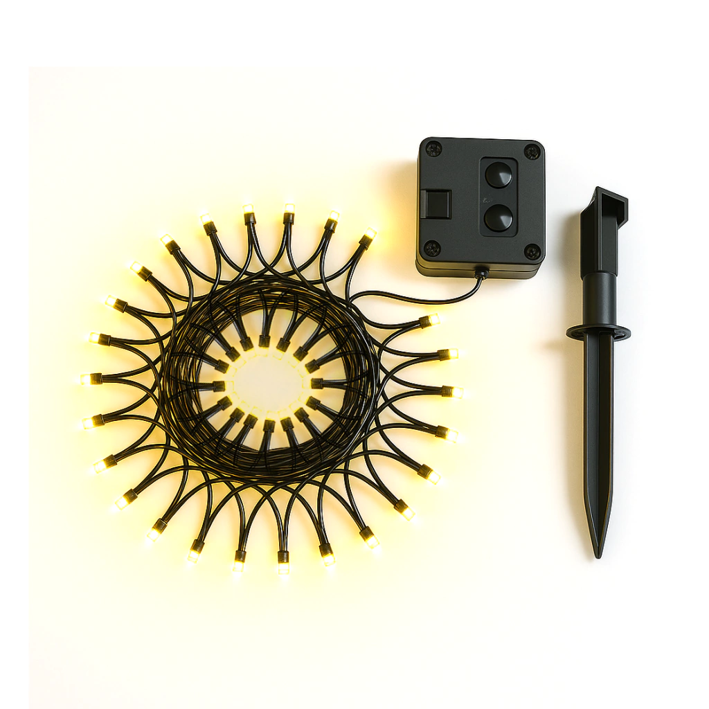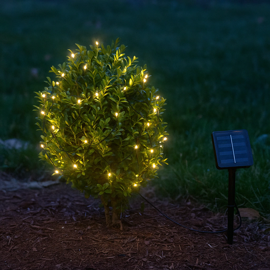 Ilumina tus espacios con estas 50 luces LED cálidas ideales para uso en exteriores e interiores. Equipadas con un práctico panel solar y estaca para facilitar su instalación en jardines, patios o terrazas, ofrecen una solución eficiente y ecológica.